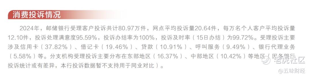 邮储银行可持续发展报告披露,2024年受理客户投诉共计80.97万件,网点平均投诉量20.64件,每万名个人客户平均投诉量12.10件。其中,关于信用卡业的投诉量最多,占总受理投诉量的37.82%。