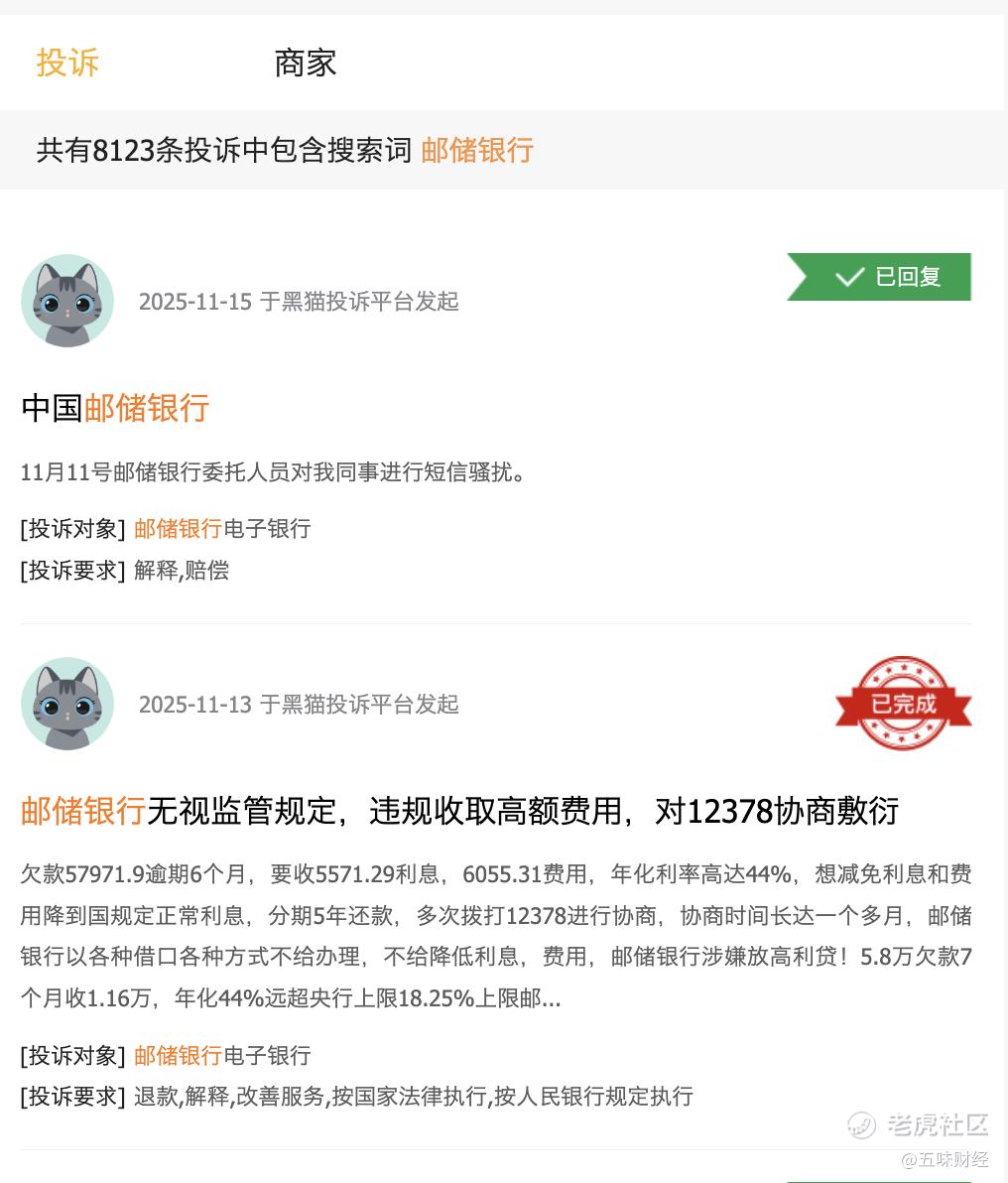 而在黑猫投诉上,关于邮储的投诉超8000条,多集中在乱收费与虚假宣传。