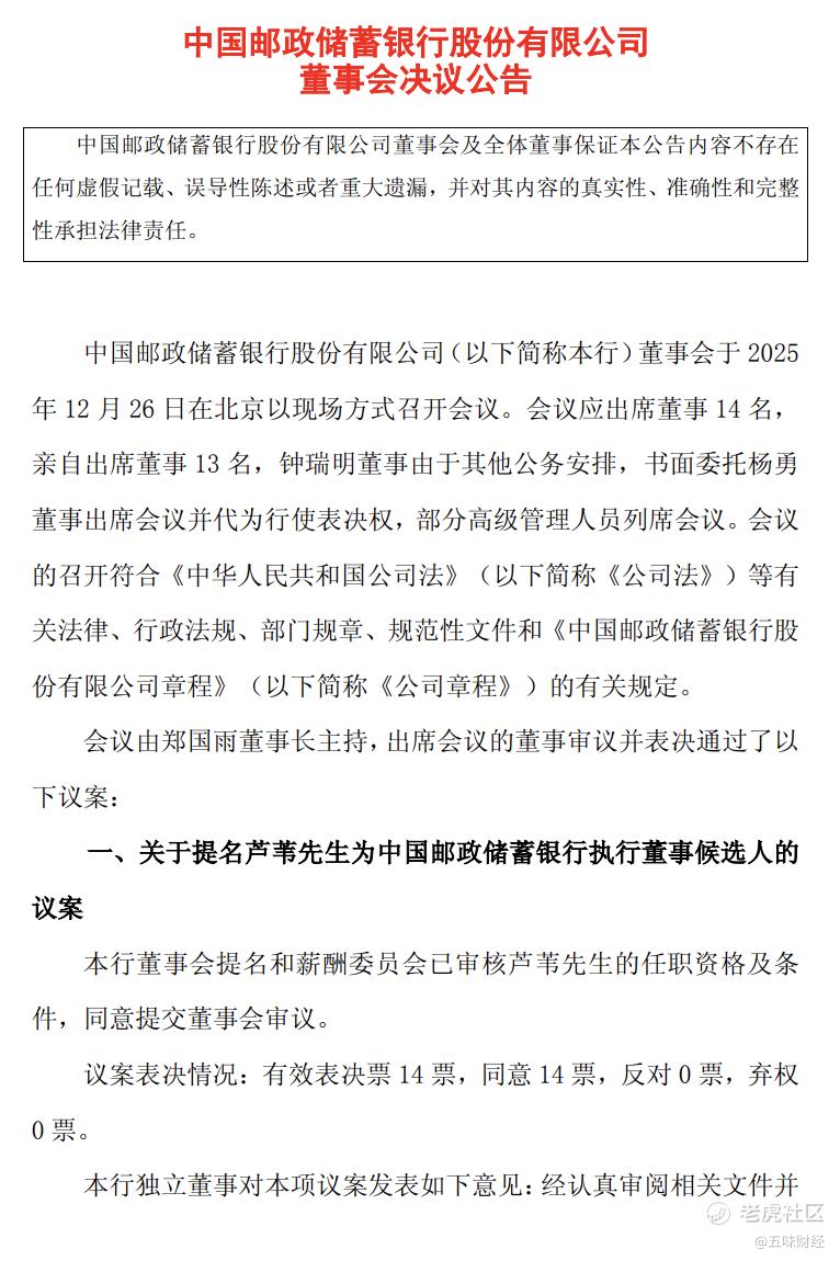 12月26日晚,中囯邮政储蓄银行公告称,该行董事会收到刘建军的辞职报告,因达到法定退休年龄,刘建军辞去该行执行董事、行长等相关职务。该行董事会于12月26日召开会议,同意提名芦苇担任该行执行董事候选人,并同意将该议案提交股东会审议;同意聘任芦苇担任该行行长,其任职资格尚待国家金融监督管理总局核准。