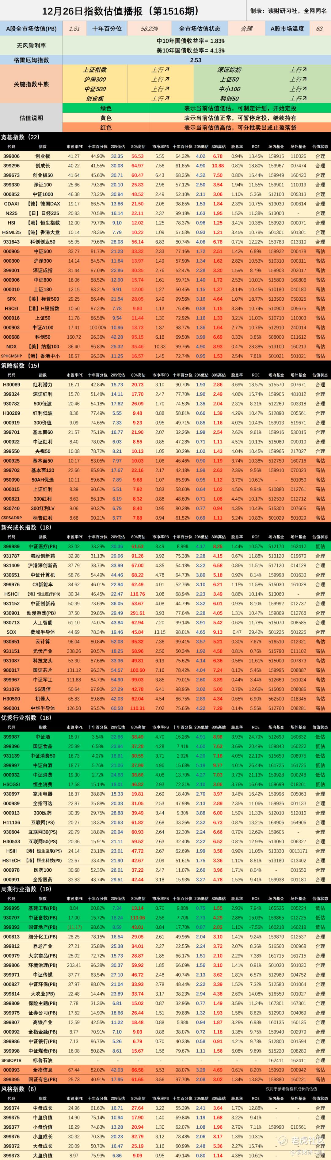 1、12月26日指数估值播报(1516期)