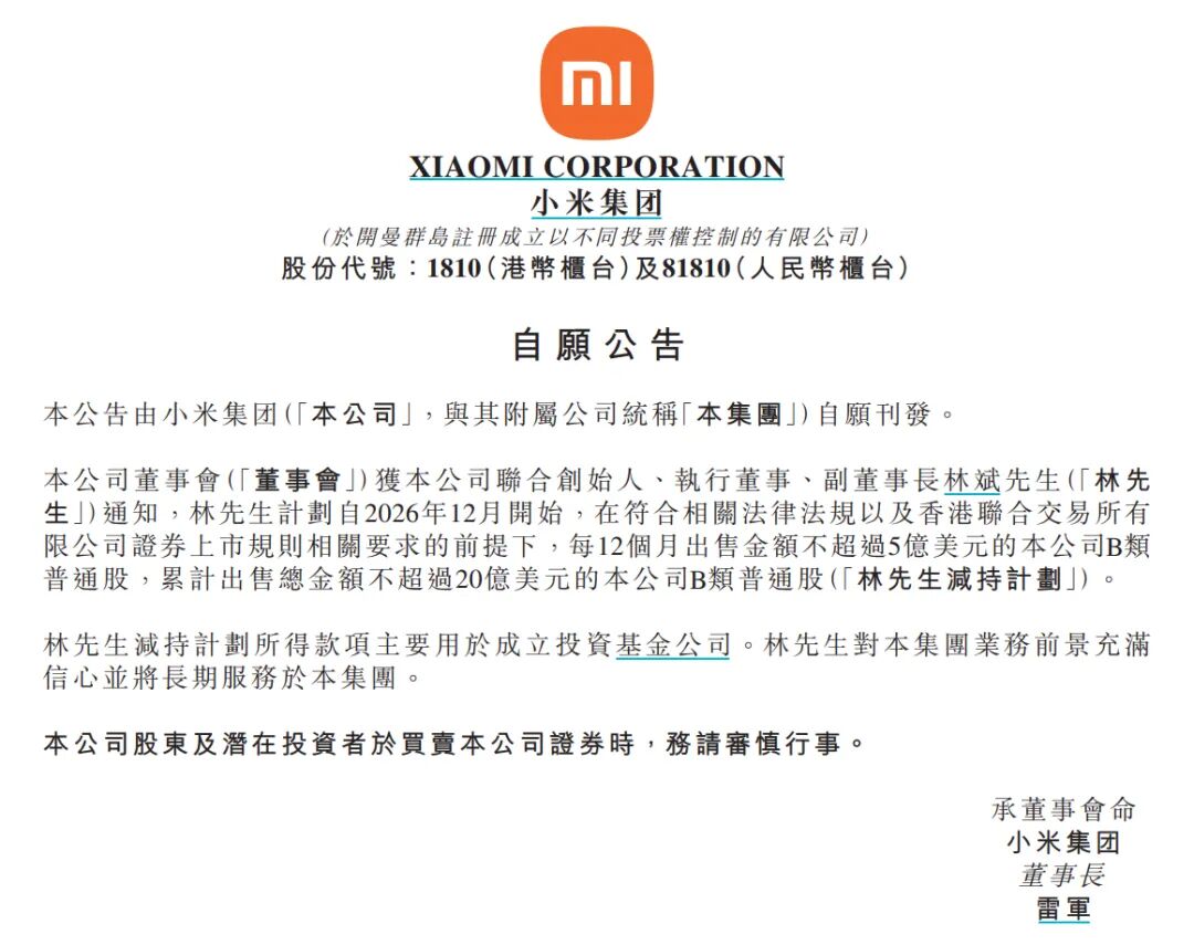 说实话timing确实有点微妙。一边是雷军刚花1300万美元增持表忠心,一边是老搭档林斌准备套现离场,这画面多少有点割裂。