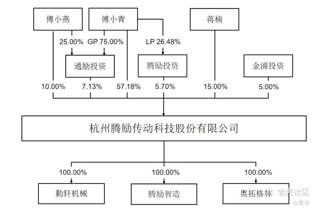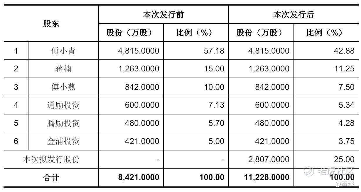 IPO后,傅小青持股42.88%,蒋楠持股11.25%,傅小燕持股为7.5%,通励投资持股5.34%,腾励投资持股4.28%,金浦投资持股为3.75%。