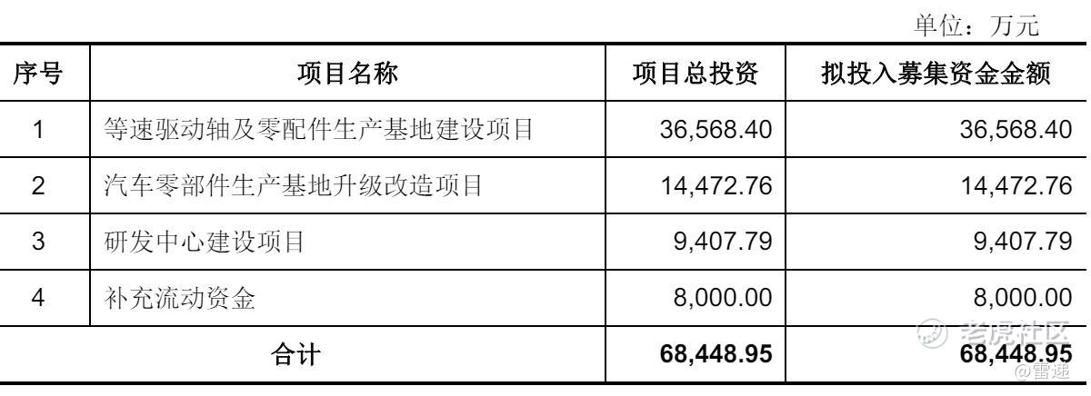 腾励传动计划募资6.84亿元,其中,3.66亿用于等速驱动轴及零配件生产基地建设项目,1.45亿元用于汽车零部件生产基地升级改造项目,9408万元用于研发中心建设项目,8000万元用于补充流动资金。