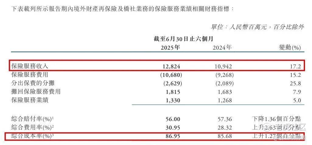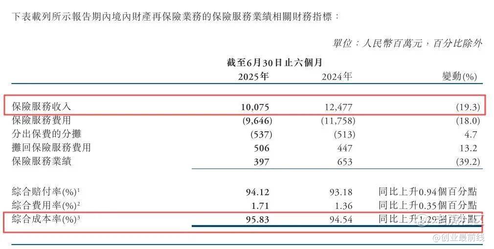 财报显示,2025年上半年该业务保险服务收入128.24亿元,同比增长17.2%。但受美国加州山火等巨灾损失影响,承保效益显著下滑。综合成本率100.06%,同比上升7.98个百分点,陷入承保亏损状态。
