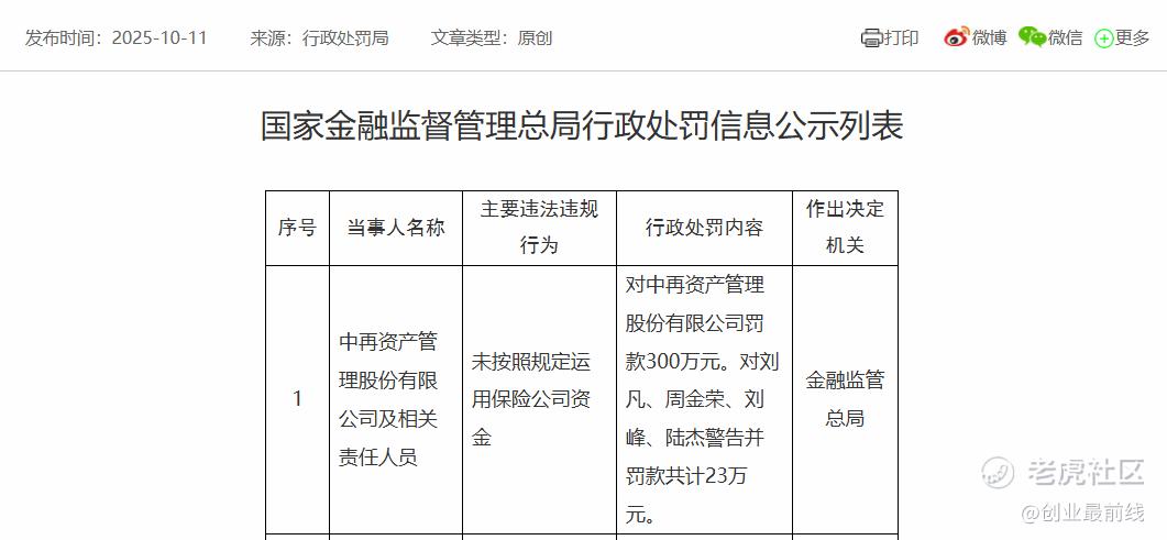 10月11日,国家金融监督管理总局披露的行政处罚信息公开表显示,因“未按照规定运用保险公司资金”的违法违规行为,中再资产被监管部门处以300万元罚款。四名相关责任人员,被予以警告并合计罚款23万元。