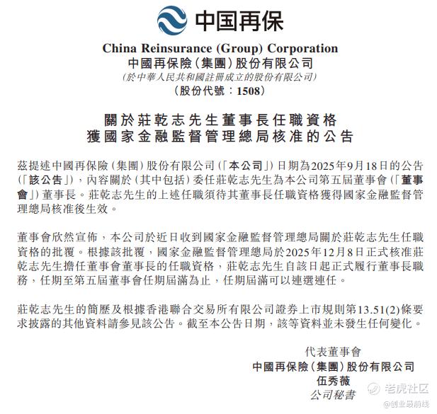 12月9日,中国再保发布公告称,庄乾志担任第五届董事会董事长的任职资格已于2025年12月8日获得国家金融监督管理总局正式核准,其自同日起正式履行董事长职务。