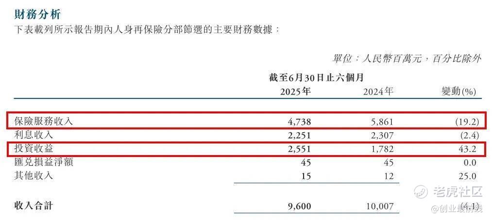 「创业最前线」注意到,占该板块保险服务收入97.9%的保障型再保险业务,2025年上半年实现保险服务收入46.08亿元。但受行业转型、保障型新业务来源和需求下降以及去年同期存在一次性释放因素影响,同比下降21.8%。