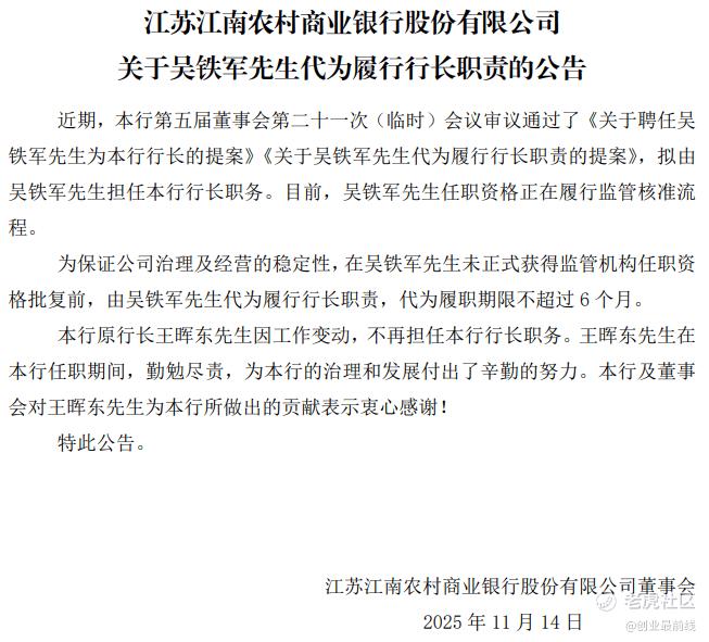 2025年11月下旬,江南农商行公告了一项高管人事变动,经董事会决议,吴铁军被聘任为新任行长,其任职资格已进入监管审批流程。在获批前,他将以代行长身份履职,代职期最长6个月。