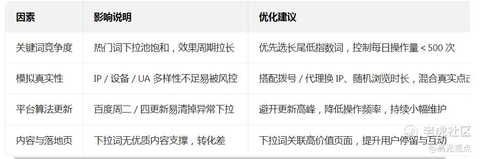 局限:热门词效果不稳定、易掉;下拉词排名无官方权重背书,转化依赖落地页质量;模拟行为若不精细,易被识别为作弊。