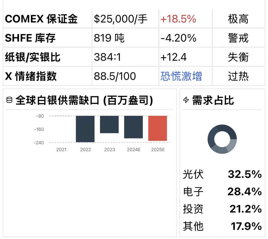 COMEX库存自2020年以来已缩减70%,目前仅余1.2亿盎司,而中国即将于2026年1月1日实施的白银出口限制政策,进一步加剧了全球供需错配的预期。
