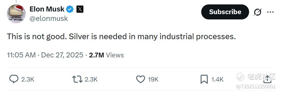马斯克在社交媒体平台X上发表上述言论的。针对关于白银价格因“严重的全球供应短缺”而出现爆炸式增长的讨论,马斯克评论称:“这不好。白银在许多工业过程中是被需要的。”