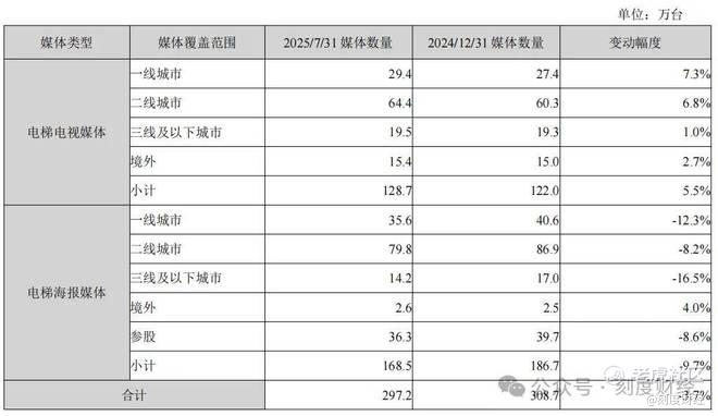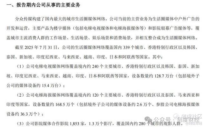 分众传媒的商业帝国,建立在对线下核心场景的垄断之上。截至2025年7月31日,公司拥有300万+电梯点位,覆盖4亿城市主流消费人群,其中电梯电视128.7万台(境内240城+境外9国),电梯海报168.5万个,楼宇媒体贡献了92.14%的营收,成为绝对的业务支柱。