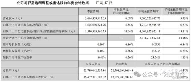 2025年前三季度实现营业收入96.07亿元,同比增长3.73%。归母净利润42.40亿元,同比增长6.87%。