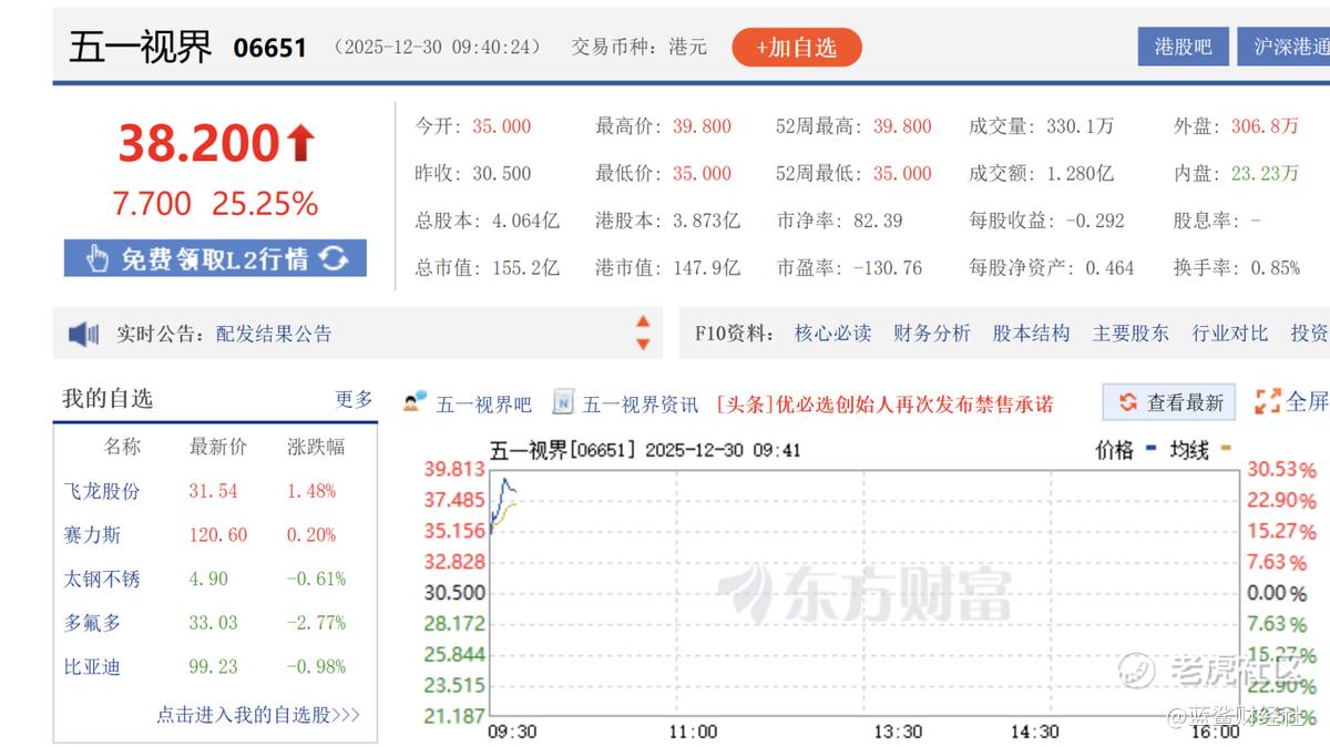 今日开盘,截至12月30日上午9时40分24秒,五一视界股价达38.20港元/股,较发行价30.5港元/股上涨25.25%,市值超147.9亿港元。