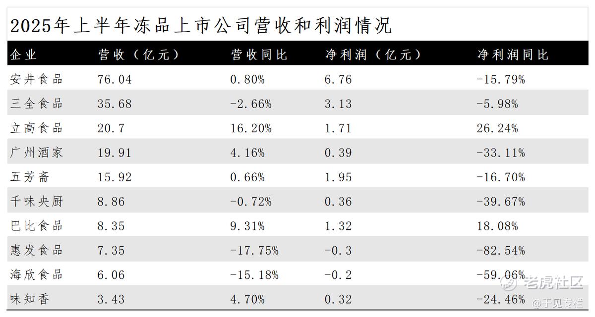 原本锅圈的品牌溢价与流通层级就使产品价格优势不明显,叠加2025年冻品行业深陷下行周期,头部企业业绩普遍承压,进一步加剧了市场价格竞争的激烈程度。以2025年上半年为例,国内多家冻品上市公司净利润下滑,甚至部分企业出现营收和利润双双失速的问题。