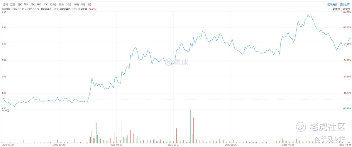 另一边却是定位“家庭自炊场景”的锅圈逆势突围:2025年第三季度,锅圈预计营收18.50-20.50亿元(同比增长13.6%-25.8%),核心经营利润6500-7500万元(同比增长44.4%-66.7%)。业绩的增长直接带动资本市场的认可,其股价从2025年1月的1.57港元/股低点,攀升至11月的4.44港元/股高点,区间涨幅接近翻倍,达98.1%。