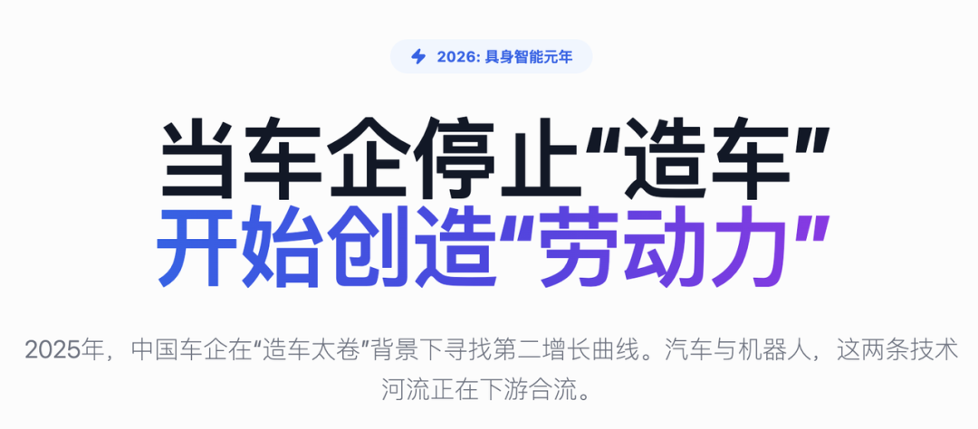 那么2025年越来越多整车企业开始系统性投入人形机器人的研究,中国车企在“造车太卷”背景下寻找第二增长曲线,从技术和产业结构的角度去看,这更像是迟早会发生的合流,汽车与机器人,本来就站在同一条技术河流的上下游。