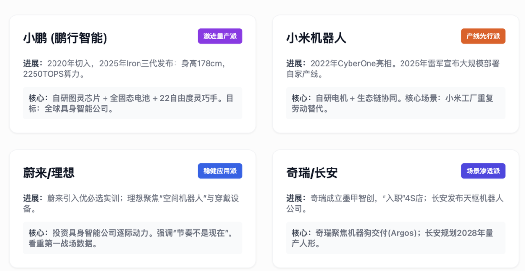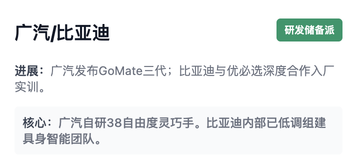 ◎ 广汽集团:2022年初:研究院启动具身智能研发,2024年12月:发布第二代/第三代GoMate(轮足结构、38自由度、自研灵巧手/电机),主要是围绕研发和展示,2026年小批量,整机逐步量产。