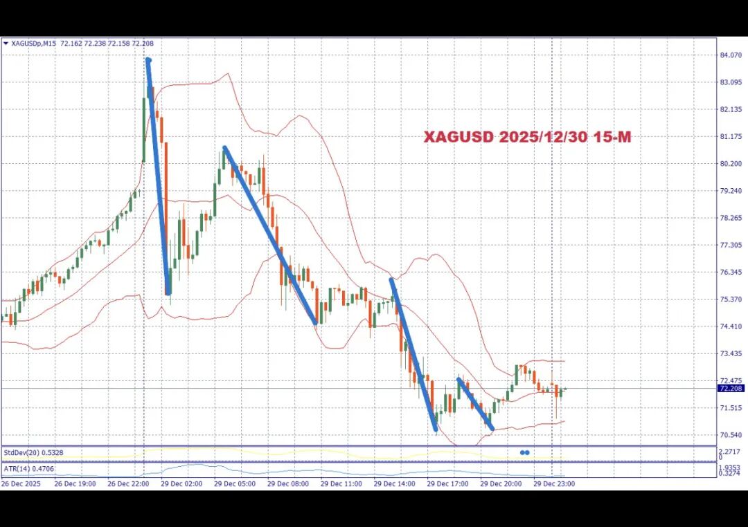 →白银昨天最高点$83.97,15分钟图呈现四浪下跌。