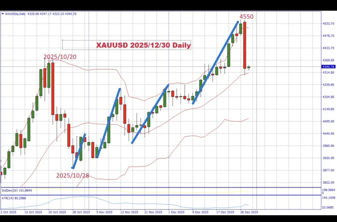 →从2025/10/28至2025/12/26,在两个月内黄金完成了四浪上升,是时候回调了。