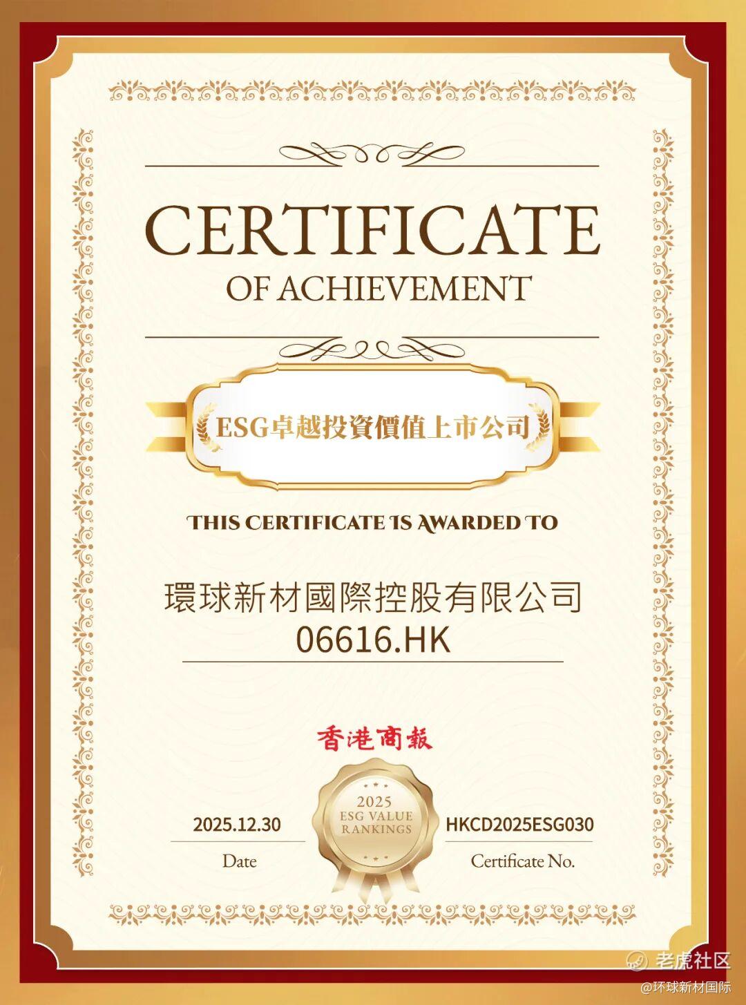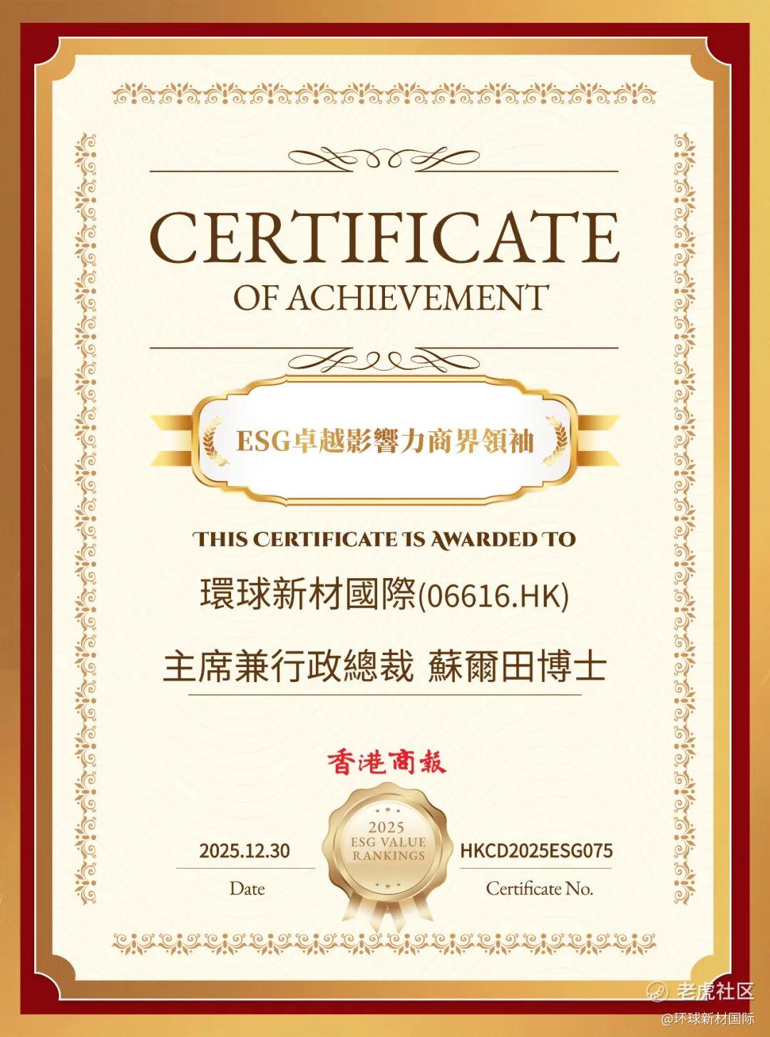2025年12月30日,由全球商报联盟、香港商报、香港经济导报联合主办的“香港全球ESG投资年会暨年度卓越ESG价值榜”颁奖盛典在香港湾仔湾景中心润维创坊举行。环球新材国际控股有限公司(股票代码:06616.HK)凭借在环境、社会及公司治理(ESG)领域的实干作为与显著成效,成功斩获“ESG卓越投资价值上市公司”称号,公司董事局主席兼行政总裁苏尔田同步荣膺“ESG卓越影响力商界领袖”奖项。两项荣誉既体现了企业在ESG建设上的深厚积累,也代表了业界的高度认可。