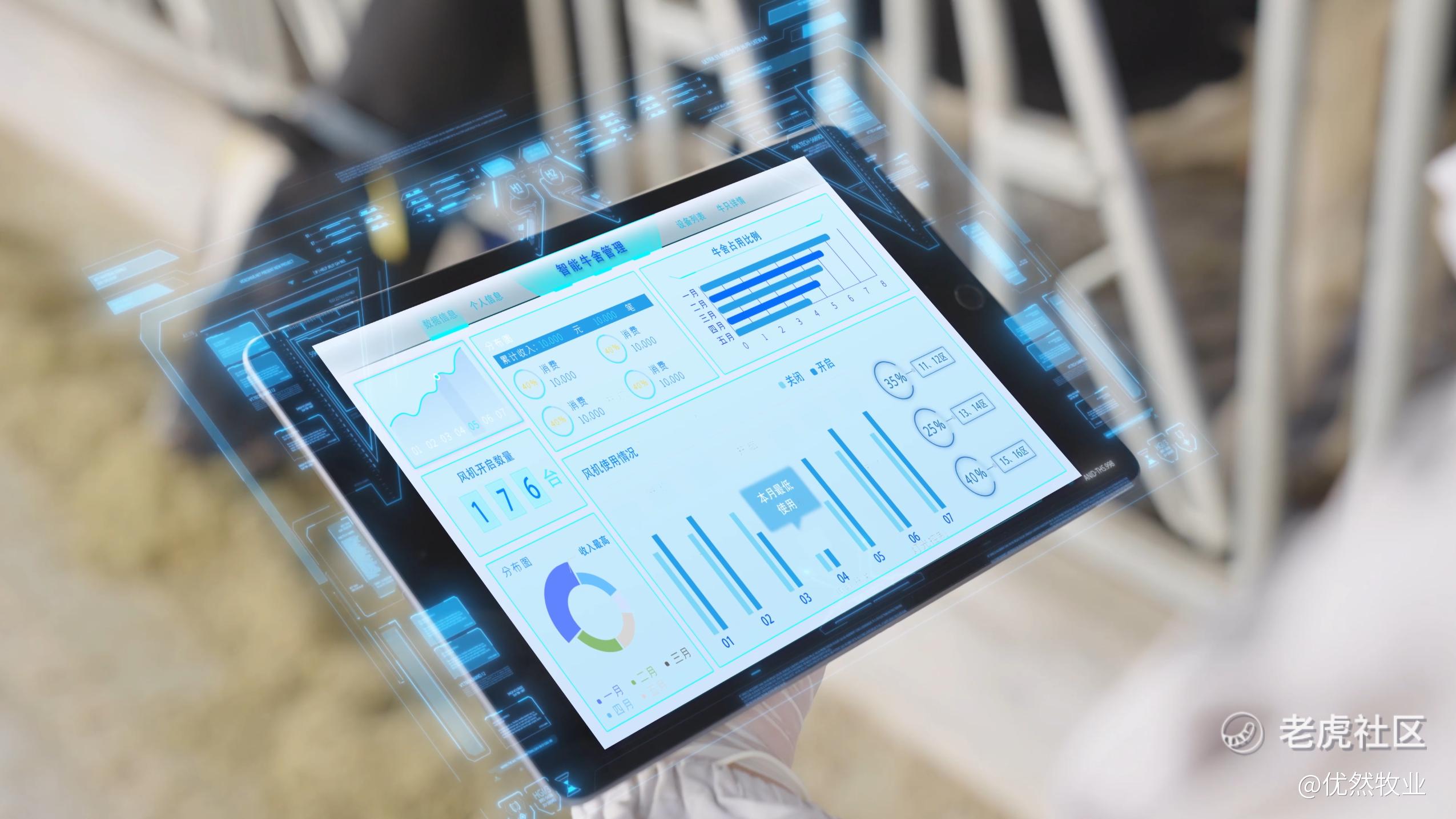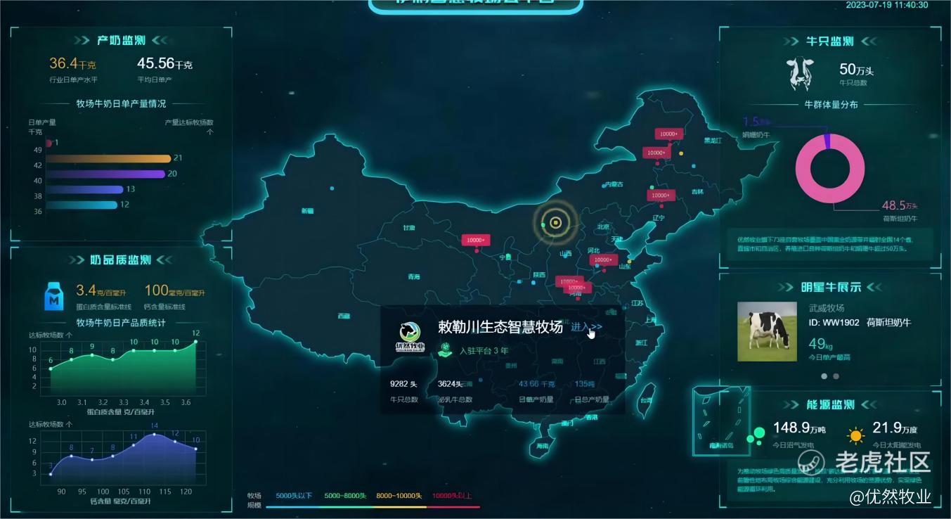 优然牧业借助自主开发的“慧牧云”人工智能大数据管理系统,牧场人员能够实时掌握奶牛的产奶量、采食量、运动量、发情等健康情况,奶牛每次挤奶都会进行一次大数据分析,相当于给奶牛进行一次体检,并自动分析体检结果形成“任务单”及时推送牧场专业人员,使其第一时间识别需要处理的奶牛。同时,牧场还通过奶牛佩戴的项圈、耳标等智能穿戴设备的数据信息,并根据牛群生理特征自主研究了分析监控模型,能够监控奶牛发情期、健康、产犊和位置等信息,帮助牧场改善牛群健康、实现精准繁育管理、预测产奶量、产奶潜力以及提升运营效率,呵护奶牛健康。