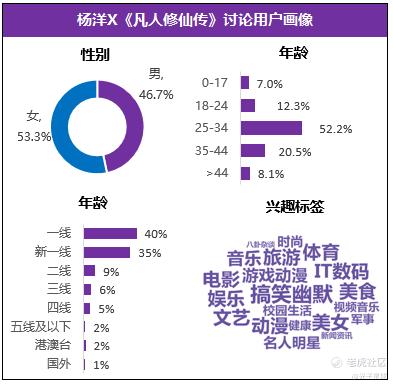 以过去被视为偶像派艺人的杨洋为例,其在《凡人修仙传》中的表演颠覆偶像标签,重塑实力演员形象。该剧作为男频顶流IP,帮助杨洋触达全新受众——男性观众占比近半,25-44岁核心用户超七成。
