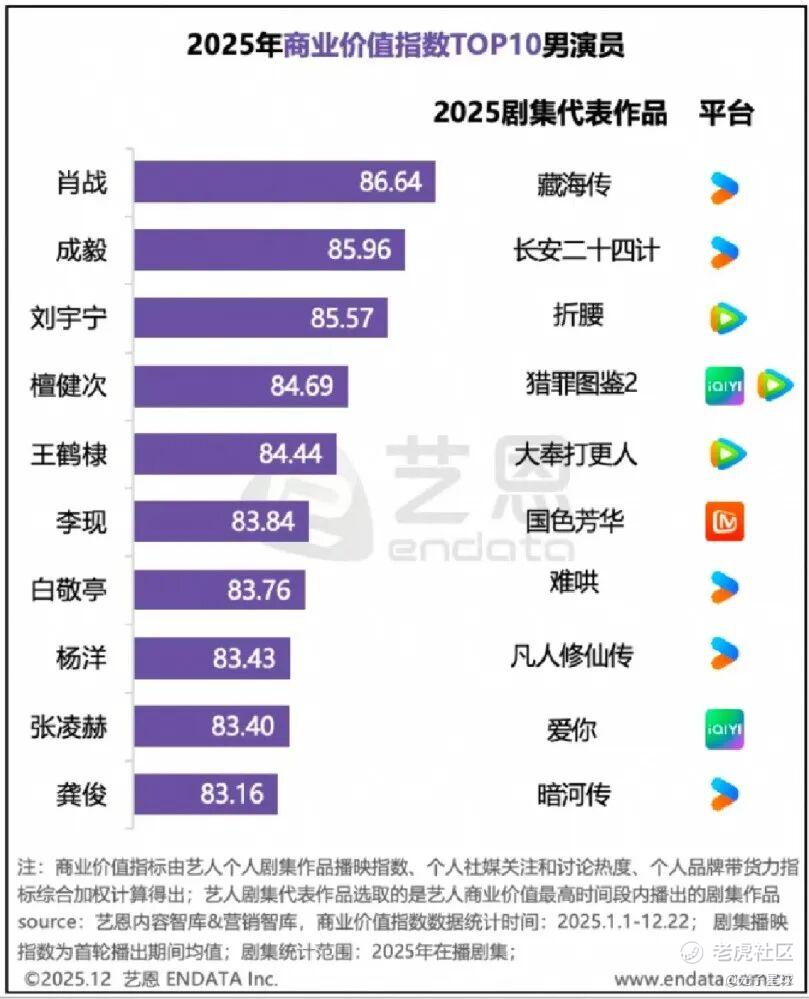 当无效供给被逐步挤出,艺人商业价值的增长不再取决于“拍了多少戏”或者是否踩中爆款,而取决于是否站在了有效供给之上。这一趋势,在艺恩于12月29日发布的《2025商业价值指数TOP10男演员榜单》中体现得尤为明显。