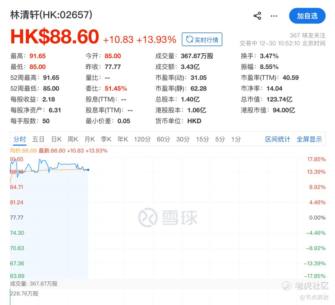 12月30日,上海林清轩化妆品集团股份有限公司(股票代码:2657.HK)正式在香港交易所主板挂牌上市,成为港股市场“国货高端护肤第一股”。上市首日,林清轩开盘报价85港元/股,较发行价77.77港元/股上涨约9.3%,按此计算,以每手50股计,投资者每手账面可赚361.5港元。
