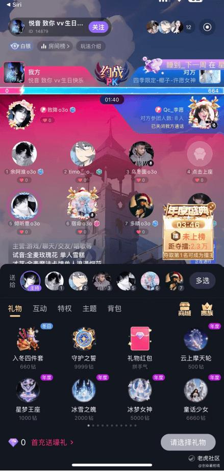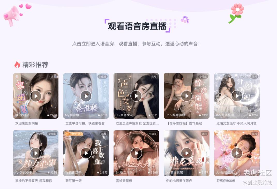 打开咕咕官网,映入眼帘的便是一众用美女主播头像的语音直播间。用户可以选择进入直播间聊天、上麦、打PK,实现语音社交。在直播间内,还可以充值送礼物、并以不同成本解锁互动、特权、主题等权限。