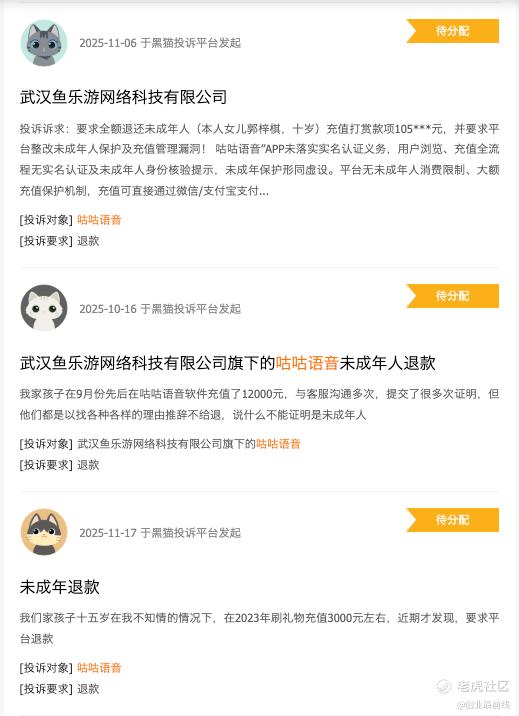 在黑猫投诉平台,也有家长发帖称咕咕语音存在未成年人保护及充值管理漏洞和退款难等问题。