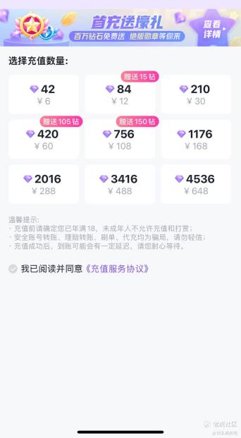 在充值界面,6元可充值42颗钻石,4536颗钻石需要耗费648元。而在直播间内,礼物价格动辄需要花费几百甚至上千个钻石。