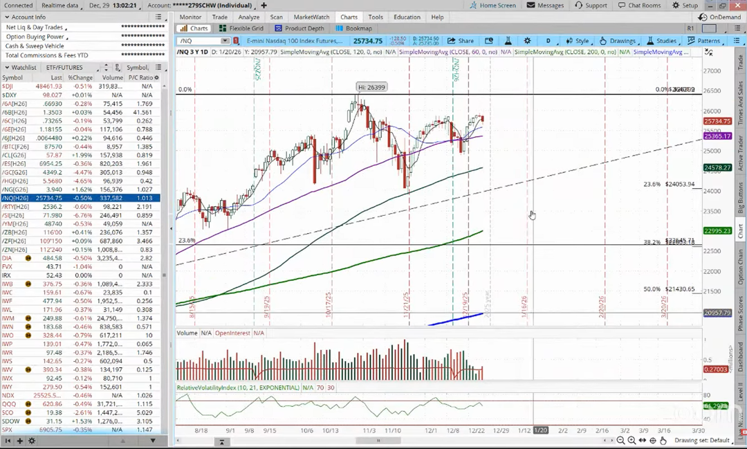 纳指在周一继续横盘整理,成交量偏低,走势缺乏明确方向。Jackson 老师强调,从右侧结构来看,纳指若能在开年后重新站上关键整数区间并测试新高,整体形态才会更具说服力。现阶段的震荡更多是时间换空间,并不构成趋势性转弱信号。