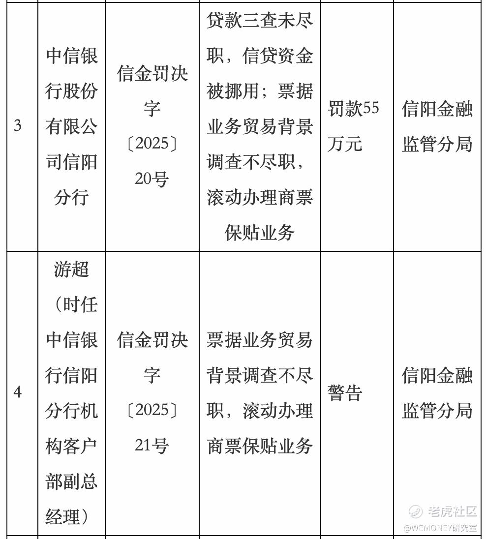 12月29日,国家金融监督管理总局信阳监管分局行政处罚信息公示表显示,中信银行信阳分行,因贷款三查未尽职,信贷资金被挪用;票据业务贸易背景调查不尽职,滚动办理商票保贴业务,被罚款55万元。