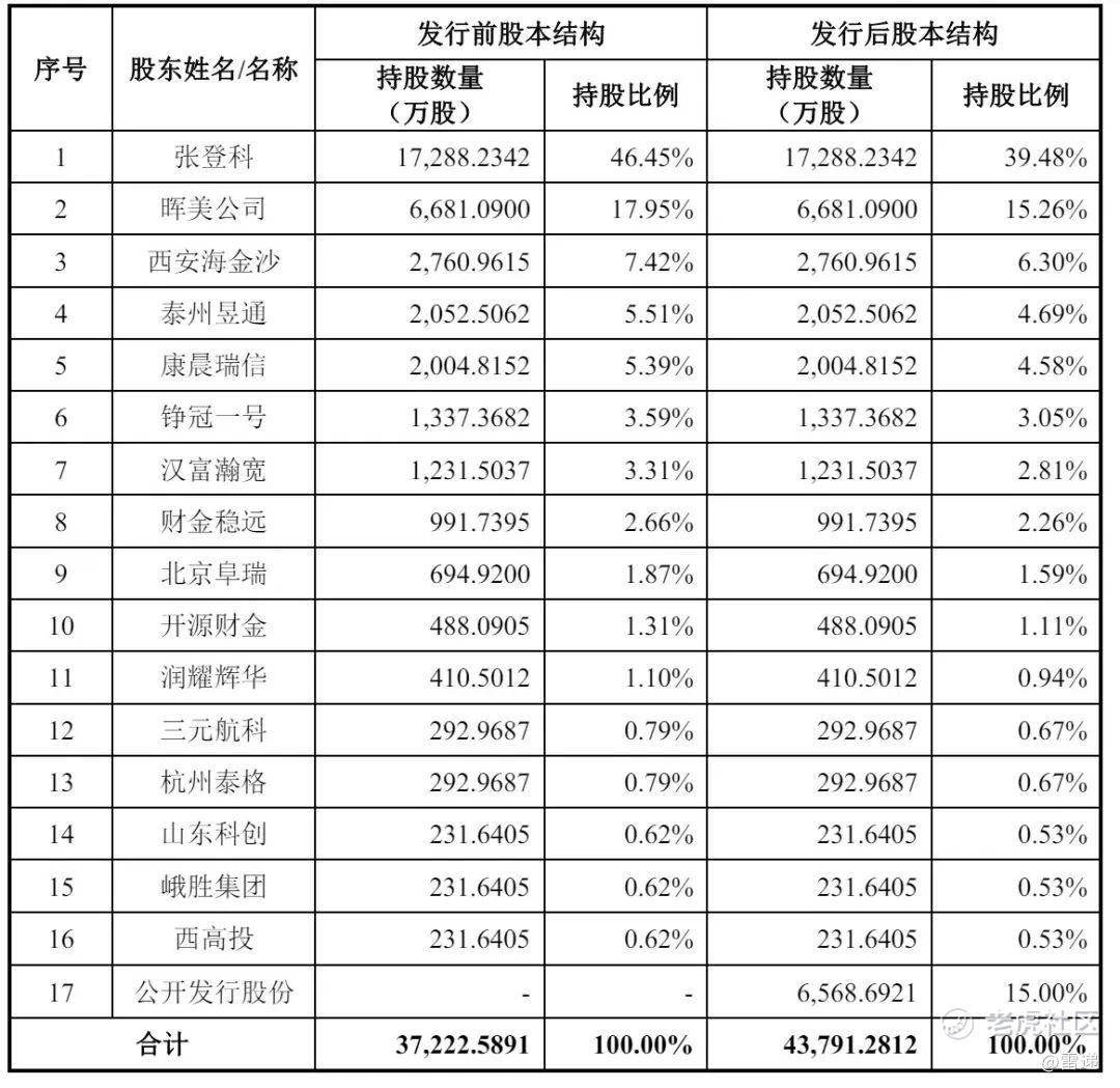 IPO后,张登科持股为39.48%,晖美公司持股为15.26%,西安海金沙持股6.3%,泰州昱通持股4.69%,康晨瑞信持股4.58%,铮冠一号持股3.05%,汉富瀚宽持股2.81%,财金稳远持股2.26%,北京阜瑞持股为1.59%,开源财金持股为1.11%,润耀辉华持股为0.94%,三元航科、杭州泰格分别持股0.67%,山东科创、峨胜集团、西高投分别持股为0.53%。