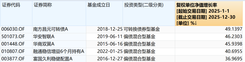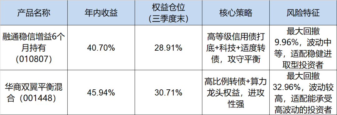掐头去尾,拿排在中间的华商双翼平衡混合(001448)、融通稳信增益6个月持有期混合(010807)为例,年内收益分别达45.94%、40.70%。而排在第一位的南方昌元可转债,年内收益已接近50%。