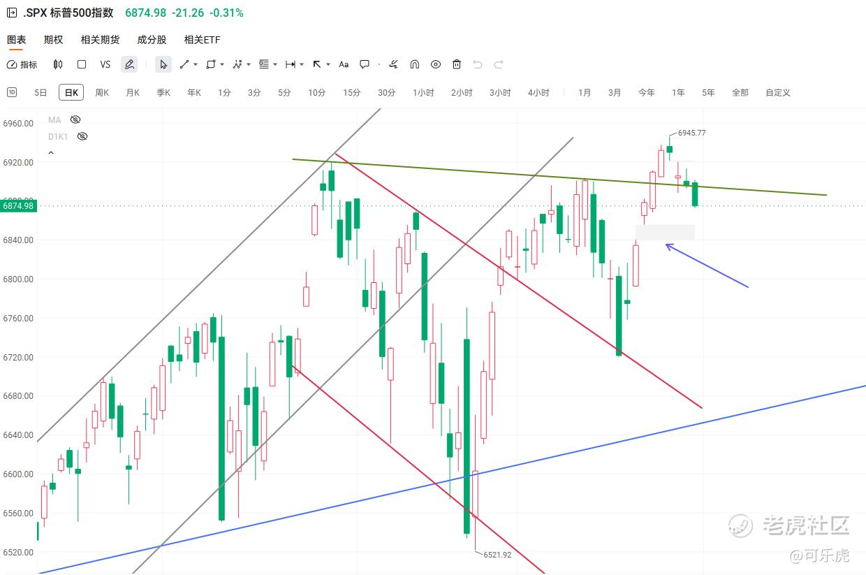 1、绿色的支撑已破,这几天都是缩量小跌,可能是要回补下方是缺口6840。 2、向上的趋势还在,短期内不会大跌。 3、个股偏平淡,今晚也不做盘中解读啦,大家新年快乐。 昨晚盘中解读提到的一支小妖股ONDS反而涨得不错。 $英伟达(NVDA)$ $特斯拉(TSLA)$ $纳斯达克(.IXIC)$ $苹果(AAPL)$ $美国超微公司(AMD)$