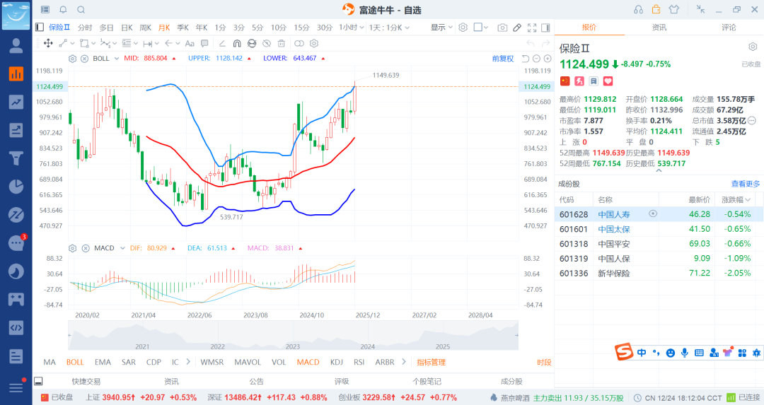 金融银行基本走完了行情,所以用保险和证券代替就可以了,保险是加强版的a股,毕竟保险公司买了不少的a股优质的资产了,只要A股走牛就是增强版的模式,而证券没怎么涨,牛市起来了证券都不会太差了,而且弹性的空间很大,之前金融要有行情,都是银行,保险,证券总有一个有行情了,你要是抓不到别指数涨了结果自己的持仓亏钱了,或者是追买了就不跌,割了就涨了,追的又不涨就尴尬了,所以就都持有就可以了。
