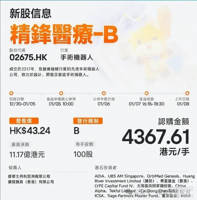 12月30日,精锋医疗正式启动香港招股,招股日期至2026年1月5日,拟全球发售2772.2万股H股,每股招股价43.24港元,每手买卖单位100股,预期将于2026年1月8日在港交所主板上市。