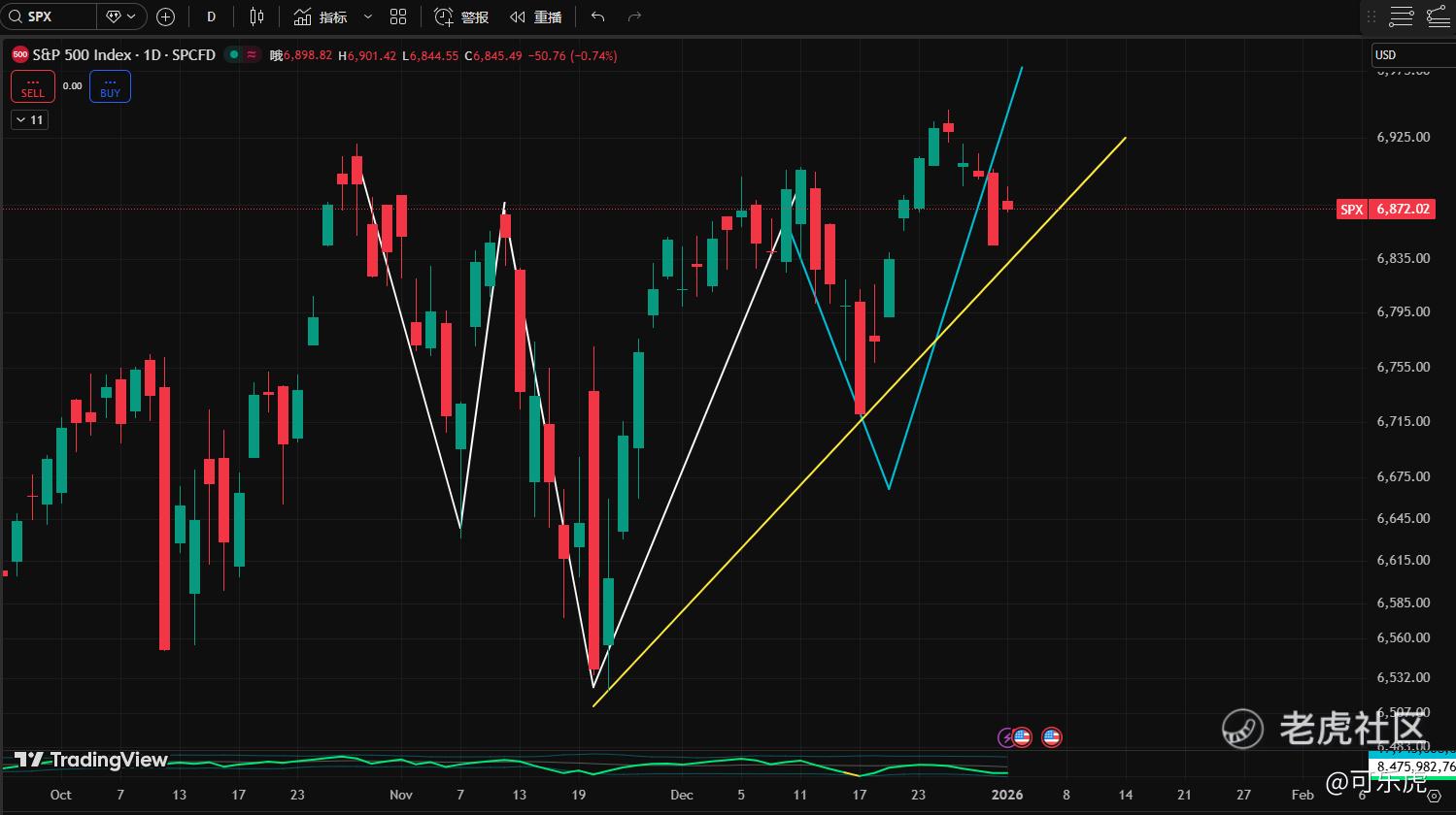 大家新年好!SPX下方的跳空已回补,先看这两天的走势如何,目前上涨的趋势还在的。短期内SPX收盘价不能跌破6820(也就是不能跌出图片中的黄线,否则1月份继续震荡的概率比较大)上方压力位6890,盘中我们再做个股解读。