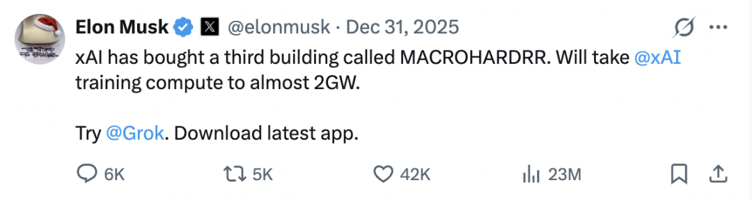 埃隆·马斯克旗下的人工智能公司xAI正在以前所未有的速度构建全球最大规模的AI训练基础设施。最新消息显示,xAI已购入第三栋名为"MACROHARDRR"的建筑,这将使其训练算力提升至接近2吉瓦(GW)的惊人水平。这一扩张不仅代表着AI竞赛进入白热化阶段,更为产业链上下游企业带来了巨大的投资机遇。