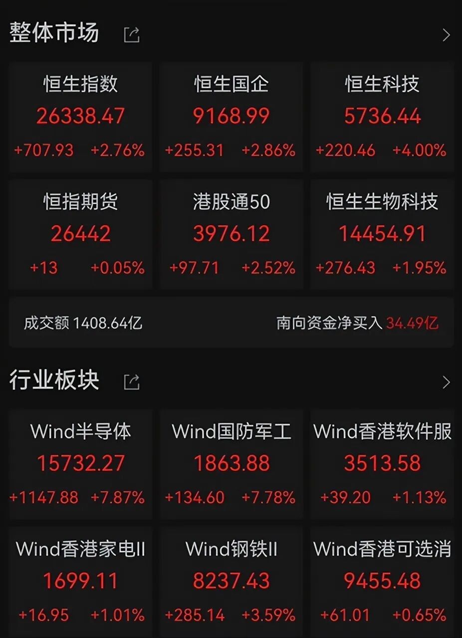 1月2日,2026年港股第一个交易日,A股的基民股民们都还沉浸在节日的欢乐之中,恒生指数高开高走,收盘上涨2.76%,恒生科技指数更是放开大涨4.00%。香港半导体行业指数大涨7.87%,香港国防军工指数大涨7.78%!