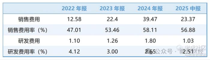 然而,这种模式的背后,暴露出一个严重问题——营销费用大幅攀升。同花顺数据显示,2022至2025年上半年,销售费用率从47%升至58.11%,今年上半年,销售费用已是研发费用的20倍。
