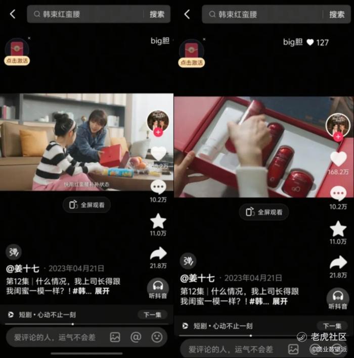 进入抖音早期,韩束并未把重心放在官方账号,而是率先把短剧引入为核心引流工具。短剧不承担品牌叙事功能,剧情负责完播率,产品在关键节点出现,直接完成从内容到交易的跳转。例如,心动不止一刻的短剧里,女主因状态不佳,朋友送上一盒红蛮腰,剧情简单,效果直观。