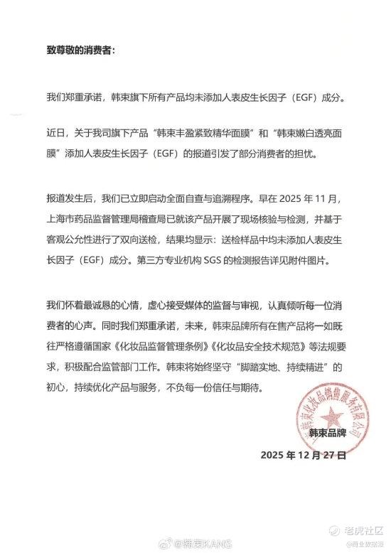 12 月 27 日,韩束发布声明回应,否认存在主动添加人表皮生长因子行为,并强调产品符合现行法规。声明同时披露,上海市药品监督管理局此前已对相关产品进行现场核验与双向送检,结果均未检出 EGF。