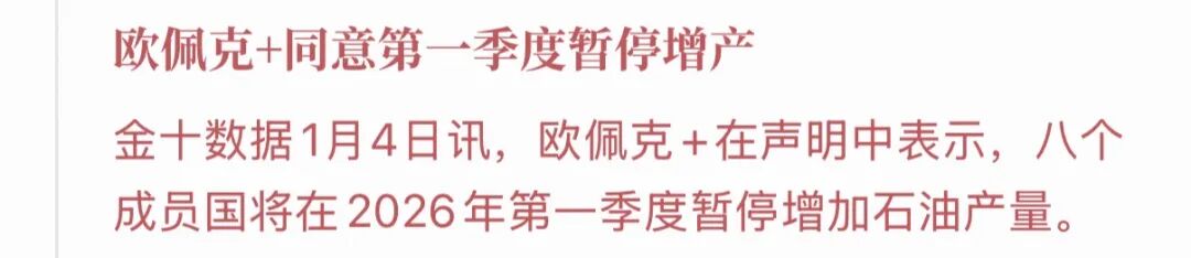 1月4日,OPEC+八国集团召开简短线上会议,重申2026年第一季度维持产量稳定,暂停此前计划的增产措施。会议仅持续约10分钟,未涉及近期委内瑞拉地缘政治事件。