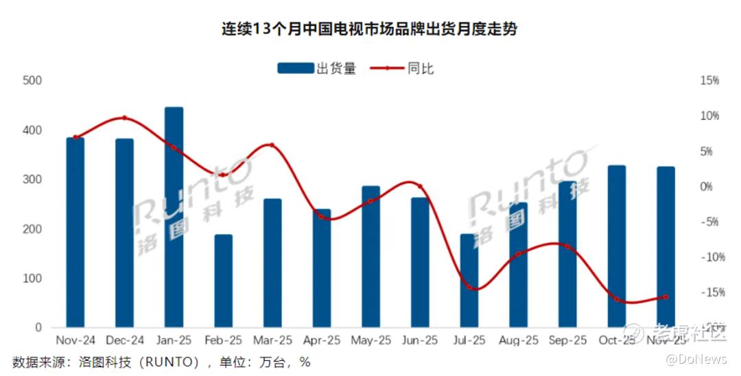 洛图科技数据显示,2025年11月电视市场品牌整机出货量约322万台,较去年同期下降15.7%,反映出AI家电的市场渗透仍处于缓慢推进阶段。