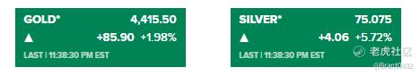 黄金:飙升至4,415.50 美元,涨幅达1.98%。