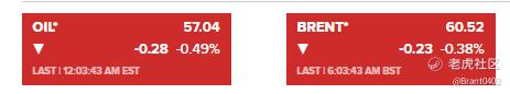 WTI原油:-0.28美元(-0.49%)至57.04美元/桶