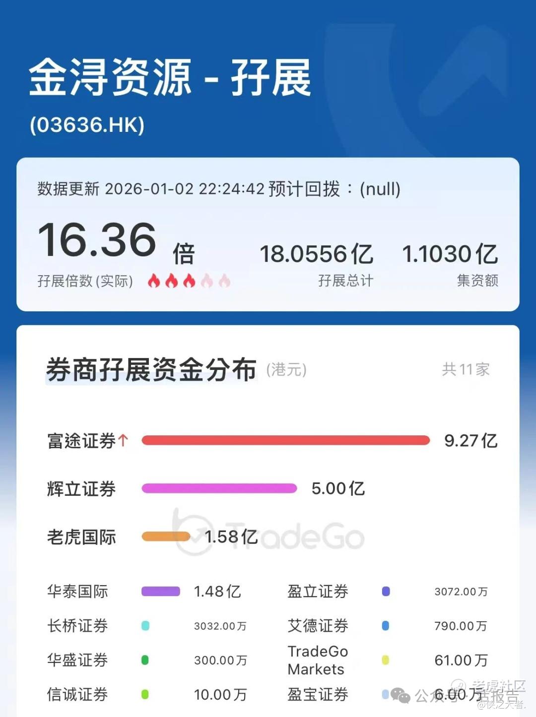 据TradeGo新股孖展数据,截至2026年1月2日22时,金浔股份孖展总额已达18.06亿港元,孖展认购倍数约16.36倍,认购已足额。其中,富途证券、辉立证券、TradeGo Markets分别放出9.27亿、5.00亿、61.00万港元。